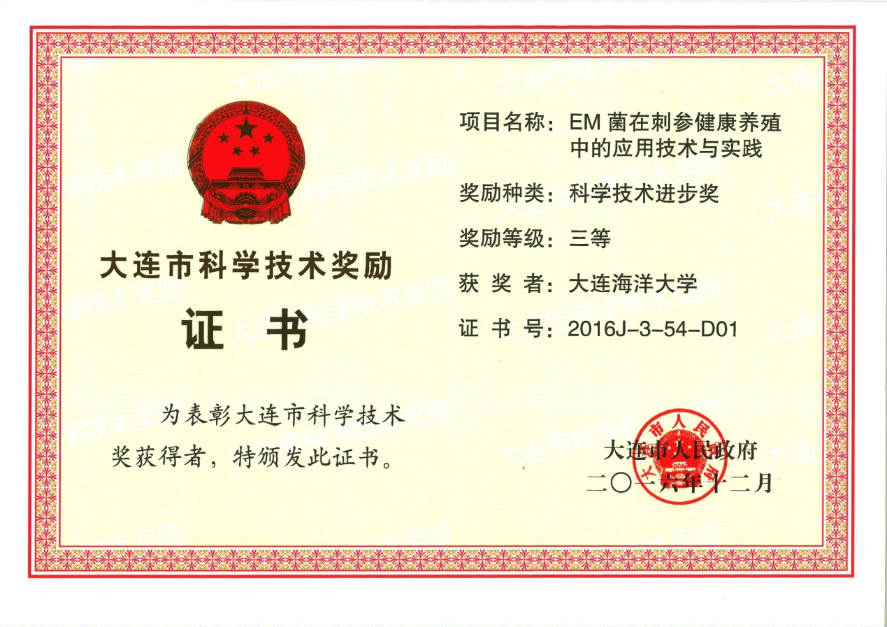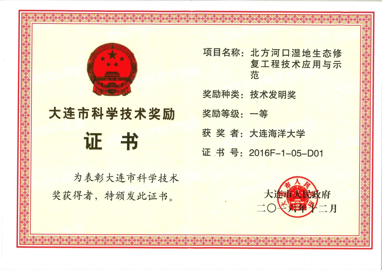 根据《大连市人民政府关于2016年度大连市科学技术奖励的决定》文件,我校周一兵教授牵头完成的《北方河口湿地生态修复工程技术应用与示范》科技成果获技术发明一等奖、王伟教授牵头完成的《EM菌在刺参健康养殖中的应用技术与实践》科技成果获科技进步三等奖。