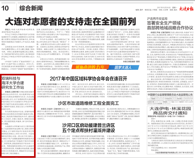 10月16日,《大连日报》A10版对我校机械与动力工程学院与大连双瑞科技有限公司合建研究生工作站等相关事宜进行了报道。