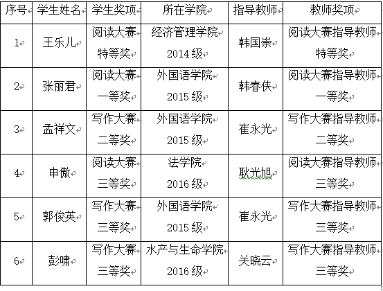 10月28日,2017“外研社杯”全国英语阅读、写作大赛辽宁省复赛在辽宁大学蒲河校区举行。我校选派的6名参赛学生喜获佳绩,其中经济管理学院2014级学生王乐儿荣获阅读大赛特等奖,在所有参赛选手中排名第二,并将代表辽宁省参加12月份的阅读大赛全国总决赛,外国语学院大英教研室教师韩国崇荣获阅读大赛指导教师特等奖。具体获奖情况如下: