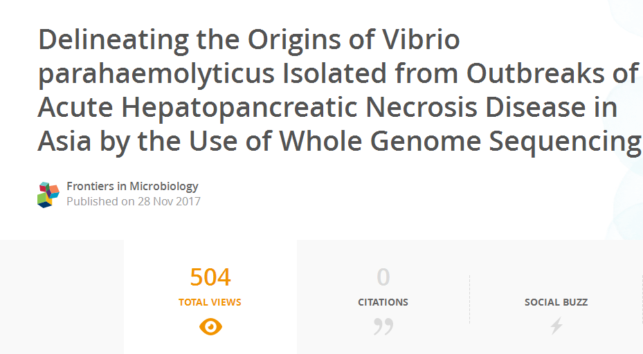 近日,我校水产设施养殖与装备工程中心傅松哲博士在水产动物重要病原副溶血性弧菌的来源和传播途径研究方面获得重要突破。他首次从基因组学水平阐述了对虾中分离的副溶血性弧菌的来源和传播途径,其研究结果发表在了国际微生物领域知名杂志《Frontiers in Microbiology》上(IF=4.076)。该研究成果的发表,立即引起了国际上相关科技人员的高度关注,目前已获得了500余次浏览和下载。(https://doi.org/10.3389/fmicb.2017.02354)
