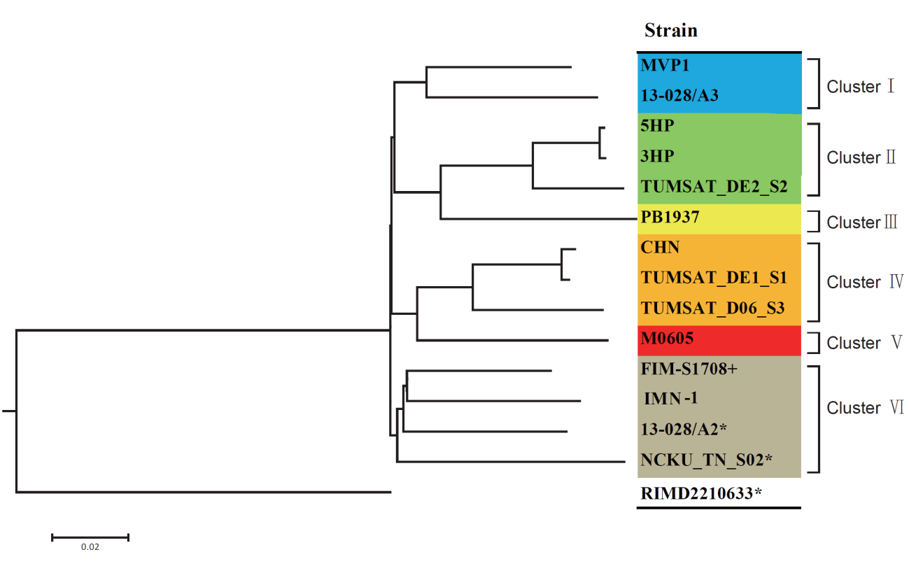 中国、越南、泰国、马来西亚和墨西哥等地对虾分离的副溶血弧菌分布于6个大类,11个不同的基因组克隆群中(Fu et al. Front Microbial.2017)