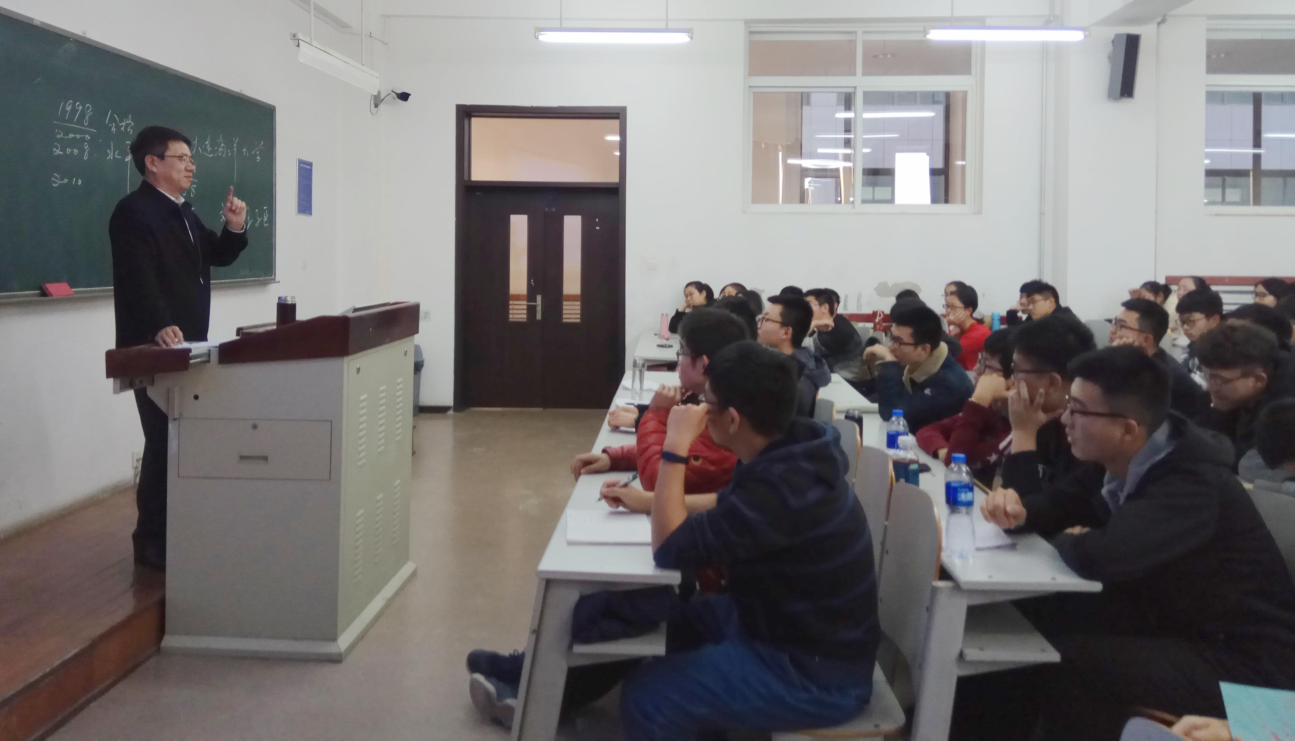 12月26日,在獐子岛教学楼327教室,校长姚杰以“大连海洋大学的历史与精神”为题,为我校近百名2017级英才班学生讲授了《大学的历史与精神》选修课。