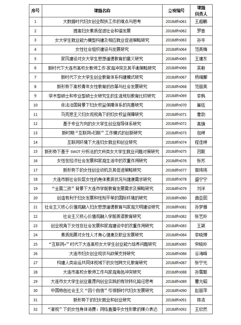 近日,大连市妇女联合会公布了《2018年度大连市妇女研究立项课题名单》,经评审,我校共获批立项课题32项。本次立项课题均与大连市妇女儿童事业发展密切相关,旨在为大连市委、市政府及有关部门提供决策参考、为妇联组织开展工作提供理论支持。具体立项名单如下: