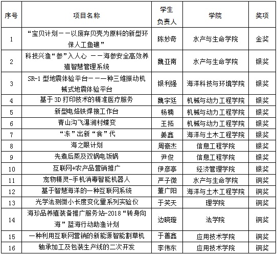 我校积极响应大赛号召,鼓励师生踊跃参与,在全校范围内举办了首届大连海洋大学“互联网+”大学生创新创业大赛,各学院共申报参赛项目232项,参赛学生达1025人,最终,评选出16个项目晋级省赛。