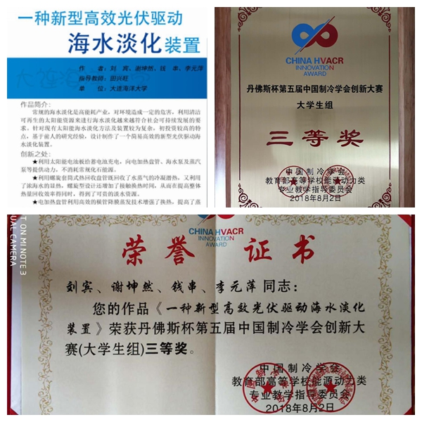 近日,丹佛斯杯第五届中国制冷学会创新大赛在山东大学(威海)成功落下帷幕。本次大赛共评选出特等奖1项,一等奖6项,二等奖15项,三等奖52项。经过激烈角逐,我校海洋与土木工程学院建筑环境与能源应用工程专业团队作品《一种新型高效光伏驱动海水淡化装置》获得大学生组三等奖。