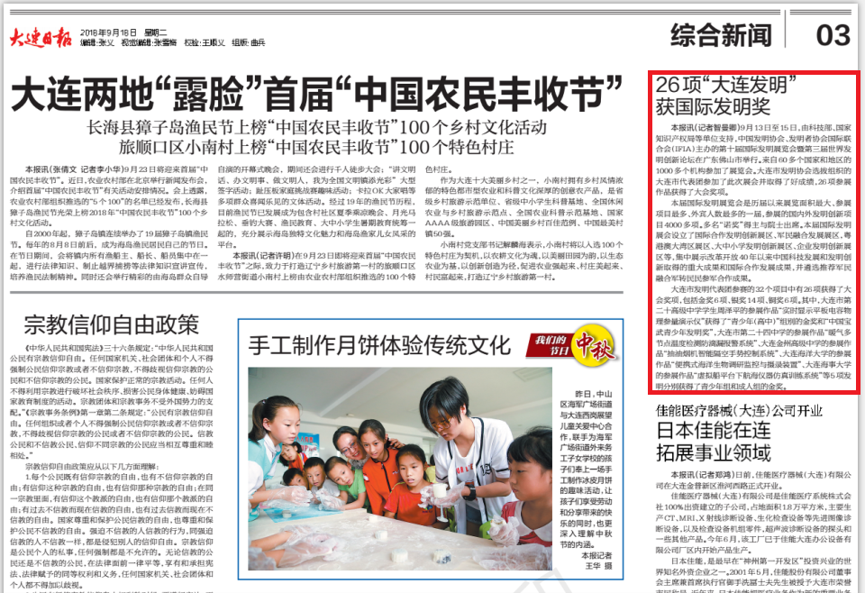 9月18日,《大连日报》A3版以“26项‘大连发明’获国际发明奖”为题报道了第十届国际发明展览会暨第三届世界发明创新论坛的举办情况,并报道了我校的参展作品“便携式海洋生物调研监控与摄录装置”获得金奖。