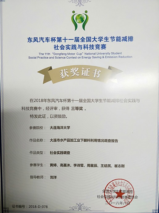 近日,我校法学院(海警学院)2016级行政管理专业学生黄婷、高嘉沐凭借《大连市水产品加工业下脚料利用情况调查报告》获得了第十一届全国大学生节能减排社会实践与科技竞赛三等奖。
