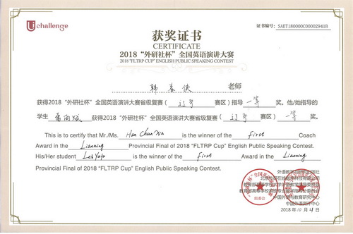 10月20日至21日,由外语教学与研究出版社联合教育部高等学校大学外语教学指导委员会和教育部高等学校英语专业教学指导分委员会等共同举办的2018“外研社杯”全国大学英语演讲比赛(辽宁省赛区复赛)在辽宁大学蒲河校区举行。我校外国语学院2017级2班英语专业学生雷雨赋以专业组第一名的优异成绩进入决赛,最终获得辽宁省赛区专业组一等奖,这是我校近年来在省级英语演讲大赛中获得的最好成绩。经济管理学院2017级学生吕雪萌获得非专业组获得优秀奖。外国语学院教师韩春侠和张艺玲分别获得优秀指导教师一等奖和优秀指导教师奖。