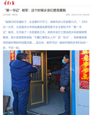 2月4日,《辽宁日报》以“‘第一书记’杨军:这个时候乡亲们更需要我”为题,报道了我校派驻建昌县素珠营子乡王君杖子村第一书记杨军同志在扶贫一线抗击疫情的工作事迹。杨军为打好这场疫情阻击战,坚守岗位,时刻心系村民,带领大家全力做好疫情防控工作,最大程度保障脱贫成果。