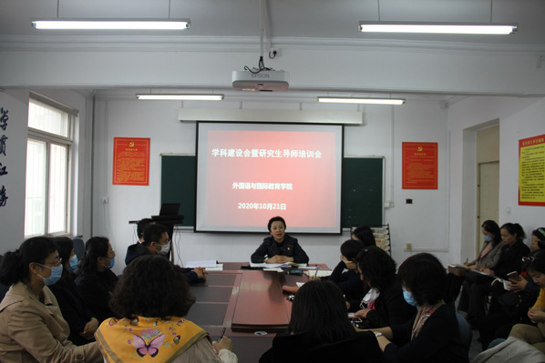 为进一步加强导师队伍建设,切实提高研究生培养质量,10月21日下午,外国语与国际教育学院2020年研究生导师培训会暨学科建设会在学院206会议室举行。院长郭艳玲、副院长王倩、副书记崔永光以及学院全体研究生导师参加了此次会议。会议由郭艳玲主持。