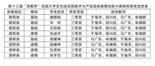 近日,第十三届“高教杯”全国大学生先进成图技术与产品信息建模创新大赛在南昌航空大学开幕。海洋与土木工程学院选派建筑组和道桥组两支代表队共10名队员参赛。经过激烈角逐,共获得个人奖项8项,其中二等奖1项,三等奖7项。