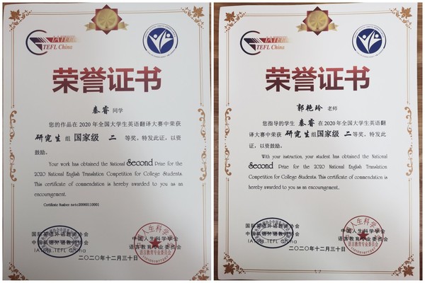 近日,由国际英语外语教师协会中国英语外语教师协会(IATEFL·TEFL China)和中国人生科学学会语言教育专业委员会主办 “2020年全国大学生英语翻译大赛”比赛结果公布,我校外国语与国际教育学院2019级英语笔译研究生秦睿同学荣获 “2020年全国大学生英语翻译大赛”研究生组国家级二等奖,外国语与国际教育学院郭艳玲教授荣获 “2020年全国大学生英语翻译大赛”研究生组指导教师奖。