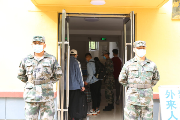 在校门口,新生有序经过行李消杀、健康(行程)码查验、48小时核酸检测阴性证明审查等手续后进入校园。为了让家长们安心、放心,各专业志愿者将报到引导和行李搬运服务前置到校门口。在整理好个人内务后,新生将在学生教官的引领下有序排队,办理保险、就餐卡等其他手续。