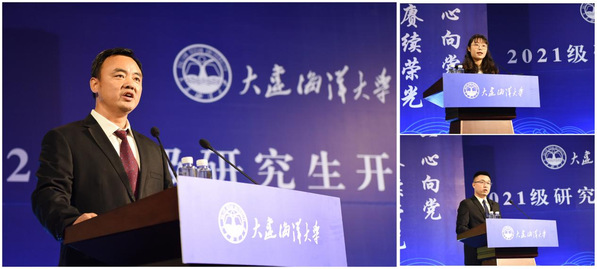 水产与生命学院研究生导师代表姜玉声教授、研究生新生代表海洋科技与环境学院喻雨诗和在校生代表海洋法律与人文学院张洋在典礼上发言。