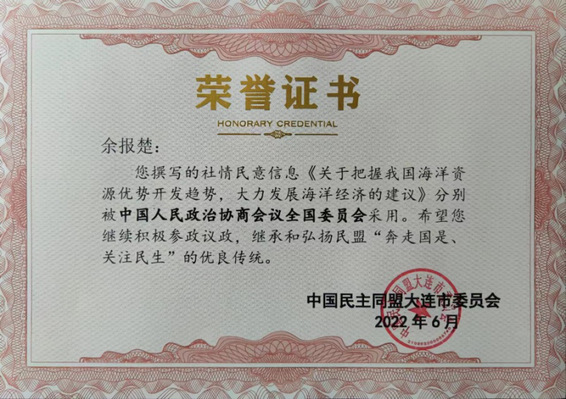 近日,我校海洋与土木工程学院教师、中国民主同盟盟员余报楚教授撰写的《关于把握我国海洋资源优势开发趋势,大力发展海洋经济的建议》被中国人民政治协商会议全国委员会采用。