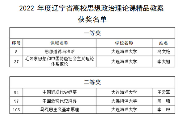 近日,由辽宁省委教育工委、省教育厅组织开展的2022年辽宁省高校思想政治理论课“精品教案”评选活动获奖名单揭晓,我校获大赛一等奖2个、二等奖3个。