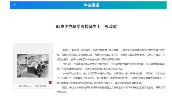 近日,半岛晨报A15版以“85岁老党员给高校师生上党课”为题报道我校马克思主义学院师生赴庄河市黑岛镇开展“找寻红色记忆”主题党日活动,活动邀请庄河市黑岛镇山南头村党总支第二党支部85岁老党员隋庆圣讲述甲午海战的历史,为师生们上了一堂生动的爱国思想政治教育课。