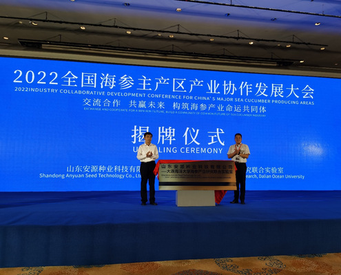 10日下午,李智军受邀参加“2022全国海参主产区产业协作发展大会”,会上李智军和烟台市副市长梁勇共同为山东安源种业科技有限公司—大连海洋大学“海参产业研究联合实验室”揭牌,实验室正式成立后,山东安源种业科技有限公司将为我校提供科研基金,用于海参产业科技研发和人才培养。