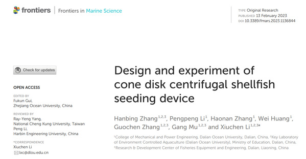 近日,机械与动力工程学院李秀辰教授研究团队在滩涂贝类机械化播苗研究领域取得重要进展,研究成果刊登在海洋领域国际知名期刊《Frontiers in Marine Science》(IF:5.247,海洋与淡水生物学1区)在线发表。