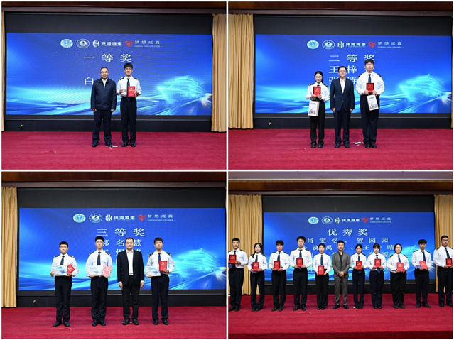 “启航新程,邮轮逐梦”演讲比赛一、二等奖获奖学生登台进行成果汇报,与会领导为获奖学子颁发证书及奖品。