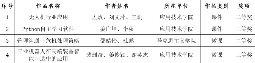 近日,辽宁省教育厅下发了《关于公布第二十九届辽宁省教育教学信息化交流活动评选结果的通知》。经过学院推荐、学校遴选、专家评议、网上公示等多个环节,我校推荐的《无人机行业应用》等四部作品,分获高等学校组课件和微课类别的二、三等奖。