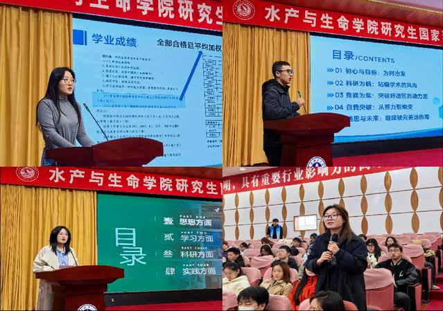 为充分发挥学院研究生国家奖学金获得者的榜样示范作用, 11月11日,水产与生命学院于图书馆报告厅举办研究生国家奖学金经验分享会,会议邀请三名国家奖学金获得者进行分享。本次活动由2024级水产专业研究生邓雅杰主持,学院全体研究生辅导员、教学秘书以及学院低年级研究生共同参与。