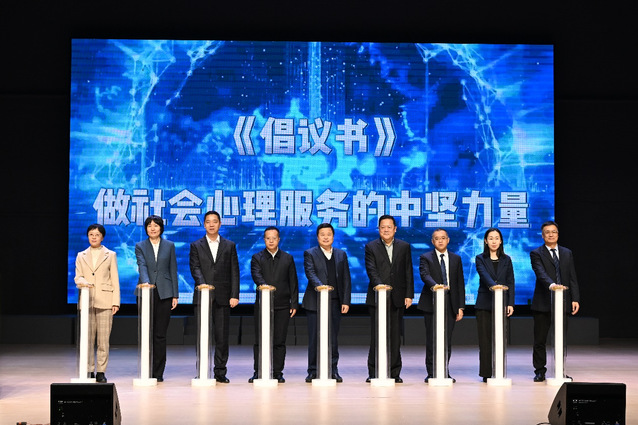 作为会议的重要环节,衣庆焘与参会领导共同启动“倡议全市心理工作者做社会心理服务的中坚力量”发布仪式。