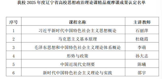 近日,辽宁省教育厅公布了2025年度辽宁省高校思想政治理论课精品观摩课成果认定名单。我校马克思主义学院六位教师申报的六门课程全部入选,获批数量位居全省第一,入选门数和课程覆盖率均创历史新高。