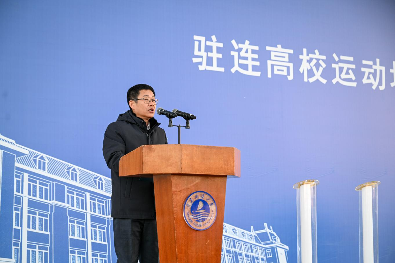 副校长刘文合代表学校致辞。他表示,高校体育场馆向社会开放,是落实全民健身国家战略、增进民生福祉的重要举措,也是释放体育资源社会价值、履行高校责任的具体体现。在属地部门精心指导下,学校已完成大黑石校区运动场升级改造,达到群众健身与赛事举办标准。黑石礁校区改造工程预计2026年4月完工并开放。下一步,学校将分阶段、有序推动两校区运动场向社会开放,为市民提供便捷健身场地,保障专业训练与公益赛事开展,并以此为契机深化校地协同,服务大连体育事业高质量发展。