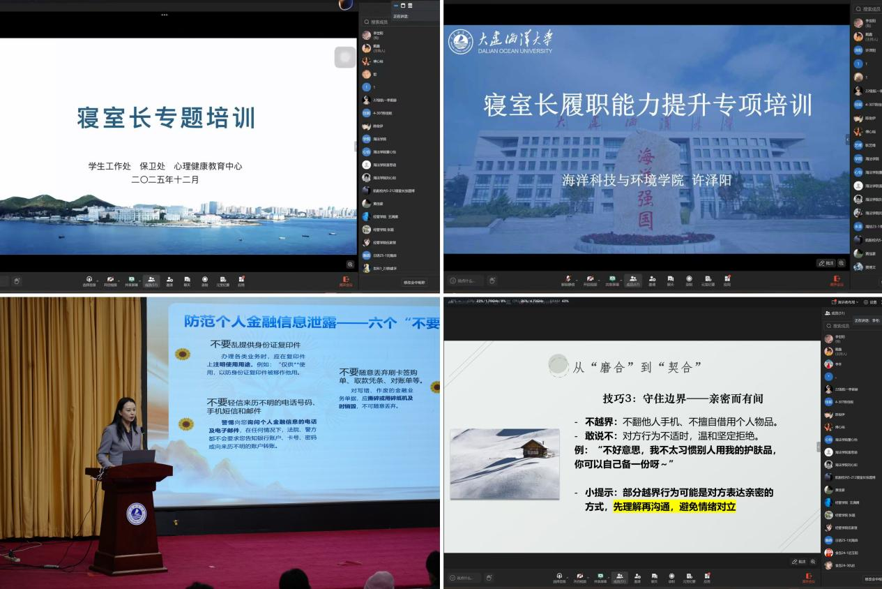 本次培训采取“学校集中组训+学院特色自训”相结合的模式。学校层面,学生工作处联合招商银行、保卫处、心理健康中心及优秀辅导员代表,分校区、线上线下相结合开展。培训聚焦角色认知、安全防范、人际沟通三大核心模块,内容涵盖寝室长职责解读、规章制度学习、消防安全演练、心理危机预警识别与矛盾调解技巧等实用技能,旨在帮助寝室长构建清晰的工作认知框架与扎实的实务能力体系。