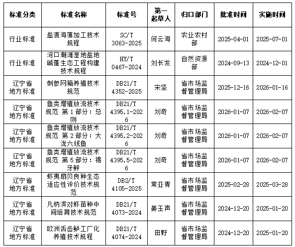 自2024年12月以来,我校已累计主持起草并获批9项政府主导标准,涵盖行业与地方两大层面,内容涉及海藻加工、湿地生态修复、特色水产品养殖及鱼类增殖放流等多个方向。其中包括《盐渍海藻加工技术规程》(SC/T 3063-2025)和《河口潮滩湿地盐地碱蓬生态工程构建技术规程》(HY/T 0467-2024)两项行业标准,分别服务于水产加工产业升级与滨海生态保护;《刺参网箱养殖技术规范》(DB21/T 4352-2025)等辽宁省地方标准,则紧密结合区域渔业发展实际需求,为地方现代渔业高质量发展提供了有力的技术支撑。