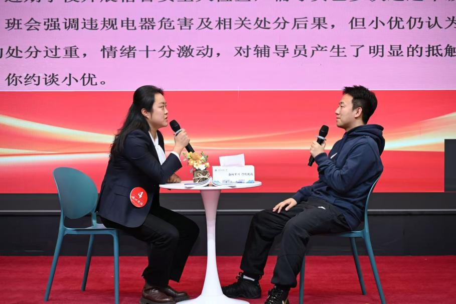 决赛设置“谈心谈话”和“案例研讨”两个环节。在“谈心谈话”环节,参赛选手与助演师生进行一对一模拟谈话,真实还原日常教育场景,全面考察辅导员的政策理解、沟通技巧与引导能力;“案例研讨”环节围绕学生思想引领、学业帮扶、心理健康、突发事件处置等真实案例展开,选手以“提问——回答”形式交流思路、共商对策。比赛中,选手们思维敏捷、条理清晰,引导得当,充分展示了我校辅导员昂扬向上的精神风貌和扎实的职业功底。