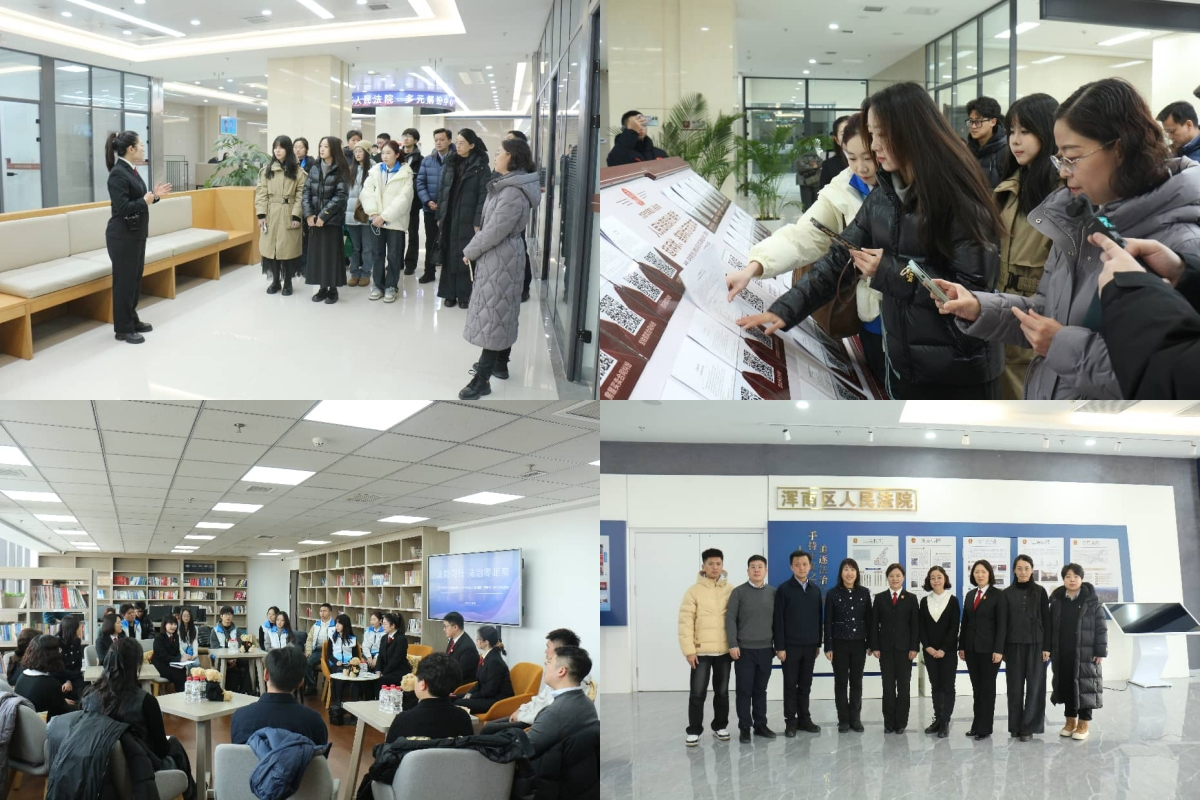 师生团队首站来到浑南区人民法院进行实践研学。区人民法院党组书记、院长王文艳,分管日常工作的副院长李冬梅带领师生重点参观了诉讼服务中心。同学们现场体验了智能化立案流程、一站式多元解纷机制以及各类便民服务设施。在随后举行的座谈交流中,法院青年法官助理与同学们围绕职业规划、法律实务等话题展开了深入交流。通过实地参观与现场互动,同学们对基层法院的日常工作与智慧法院建设成效有了直观认识,进一步理解了“司法为民”宗旨的时代内涵与实践路径。