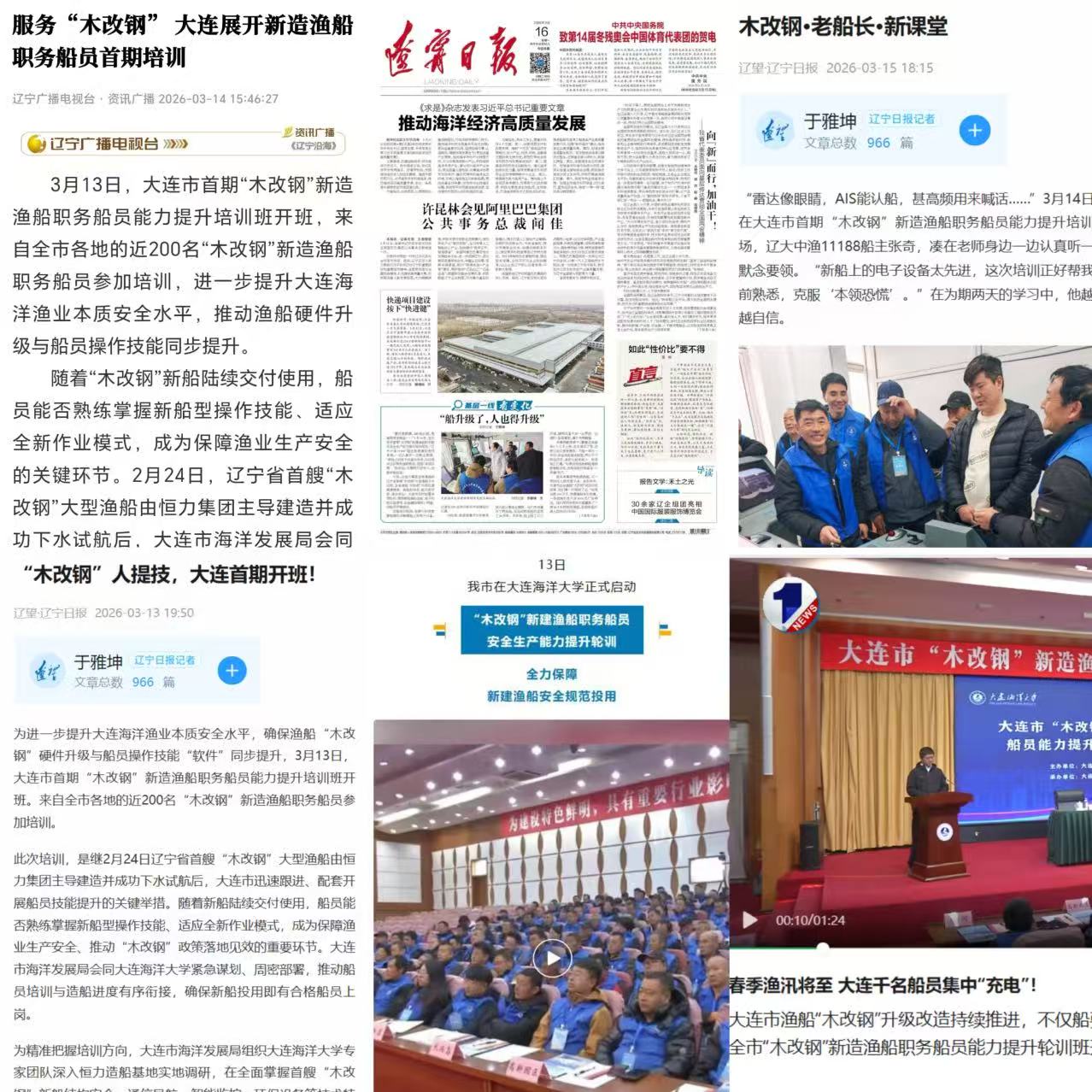 近日,辽宁日报·辽望客户端、辽宁广播电视台、大连新闻及大连发布等媒体平台对我校船员培训学院开展的“木改钢”新造渔船职务船员能力提升培训进行了专题报道。