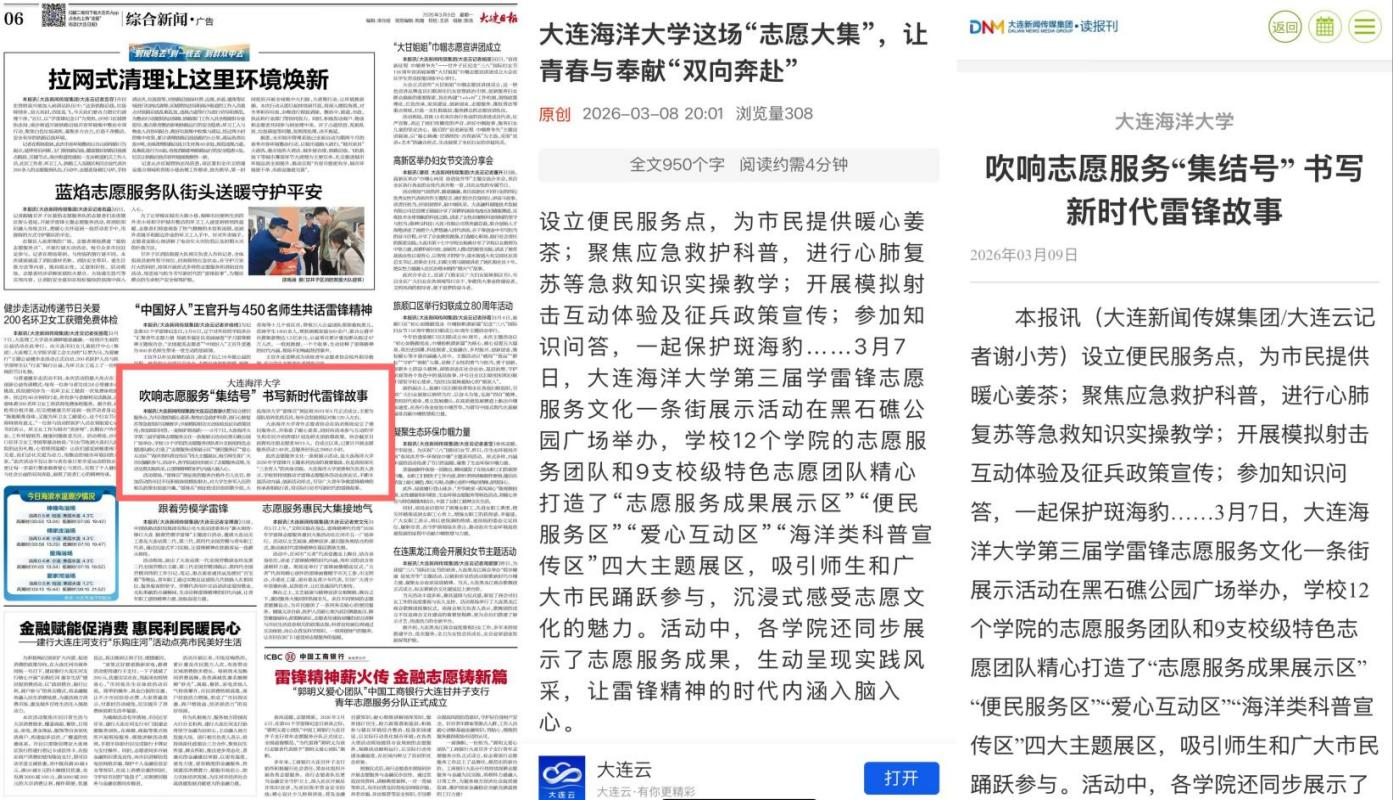 近日,大连日报、大连云等媒体平台对我校开展的第三届学雷锋志愿服务文化一条街展示活动进行了专题报道。