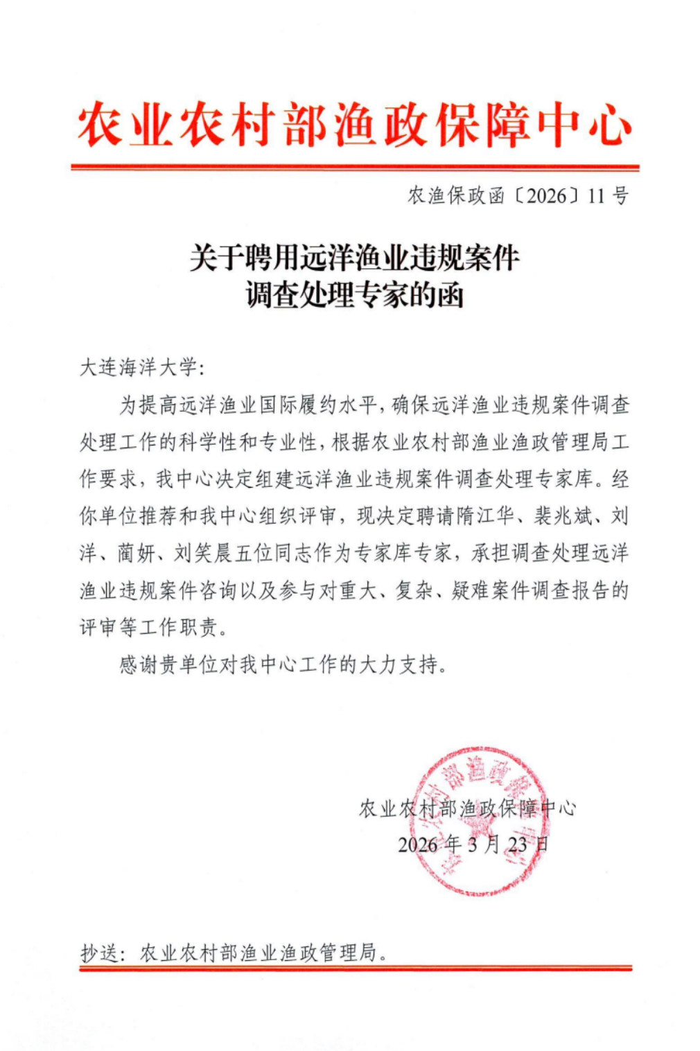 远洋渔业是我国实施海洋强国战略的重要内容,提升国际履约能力和案件调查处理水平,对维护国家海洋权益、推动渔业高质量发展具有重要意义。我校五位教师长期从事远洋渔业管理领域的教学与科研工作,具备扎实的专业基础和丰富的实践经验。受聘后,他们将承担远洋渔业违规案件调查处理的咨询工作,并参与重大、复杂、疑难案件调查报告的评审等职责。