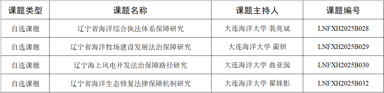 本次课题立项经过个人申报、单位推荐、省法学会学术委员会评审、报党组同意,最终确定重点课题9项、自选课题62项。东北亚研究中心此次获批的4项课题聚焦海洋法治前沿领域,涉及海洋综合执法、海洋牧场建设、海上风电开发、海洋生态修复等热点与难点问题,充分体现了东北亚研究中心在海洋法治研究方面的持续深耕和学术影响力。