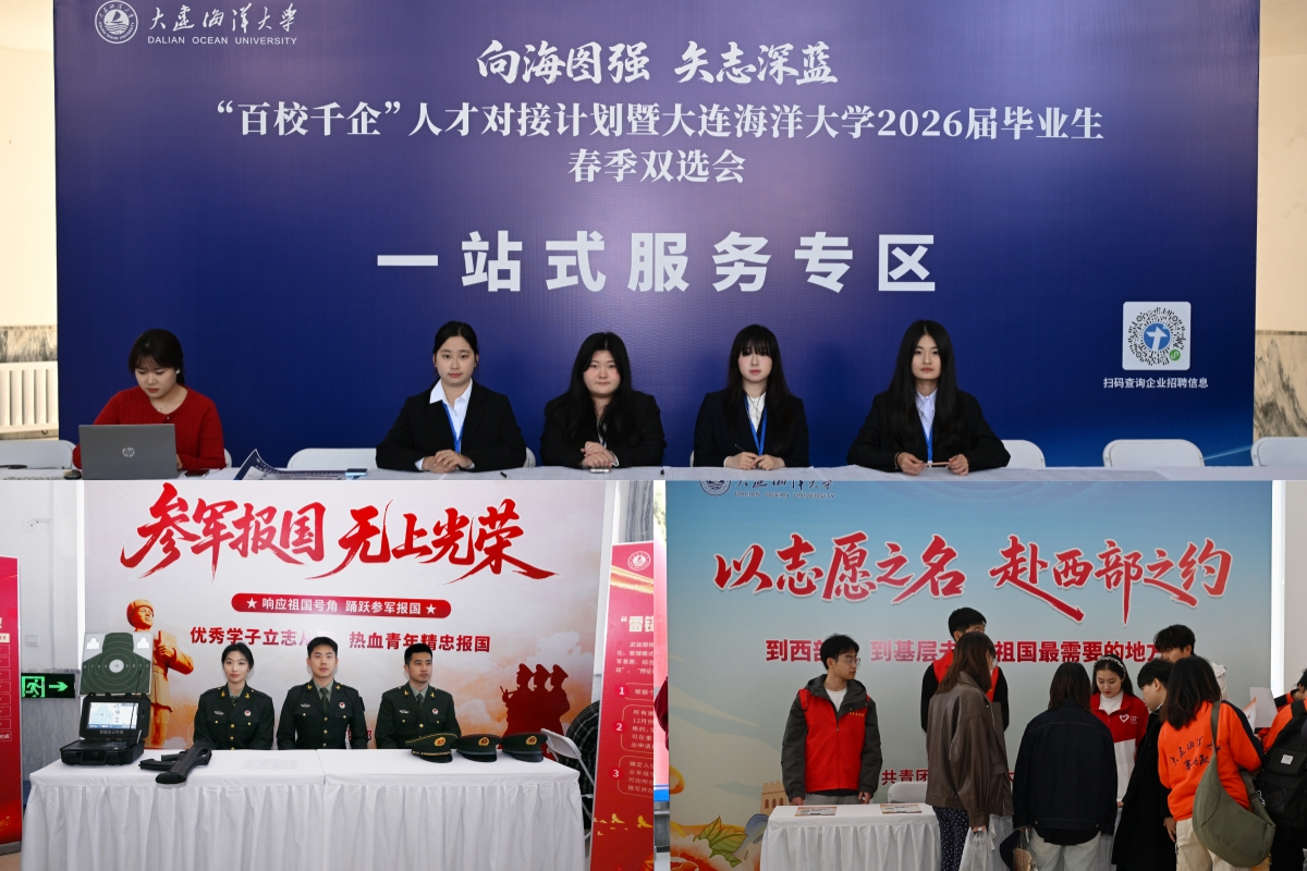 为贯彻落实国家及辽宁省高校毕业生就业创业工作部署,抢抓春季招聘关键期,3月27日,我校在黑石礁校区举办“百校千企”人才对接计划暨大连海洋大学2026届毕业生春季双选会。校党委书记王伟辰、党委副书记李智军、副校长刘文合深入双选会现场,走访用人单位,并督导就业服务工作,相关职能部门及各学院负责人陪同走访。