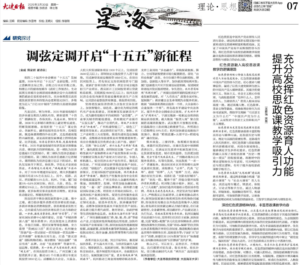 3月30日,《大连日报》理论版刊发大连市政府研究室与我校马克思主义学院2024级研究生师家琪、崔诗萌共同署名文章《调弦定调开启“十五五”新征程》。